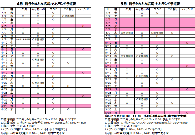 「ととランド」は子ども達が、保護者のみなさんと一緒に遊べる、みなさんの子育てを応援するところです。日曜日が休日のお父さん、平日に子育て広場に行けないお母さんもぜひお好きな時間にお気軽にお越しください。月ごとに遊びを計画しています。