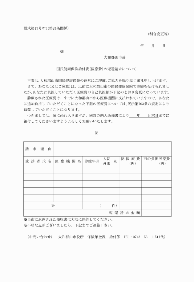 13の3 | 国民健康保険(医療費)の返還請求書(割合変更等) | |