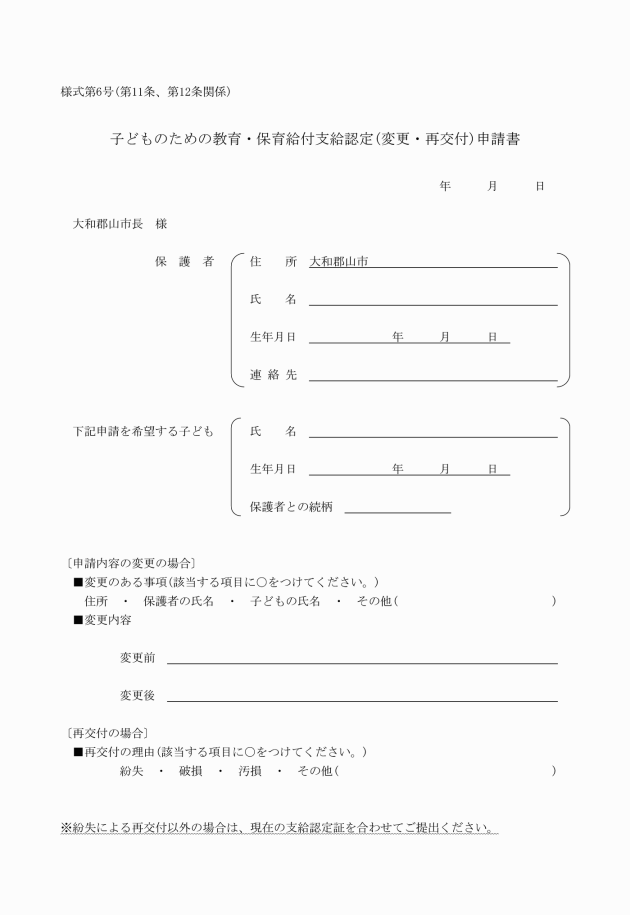 第12条 府令第16条第2項の規定による申請は、子どものための教育・保育給付支給認定(変更・再交付)申請書(様式第6号)によるものとする。