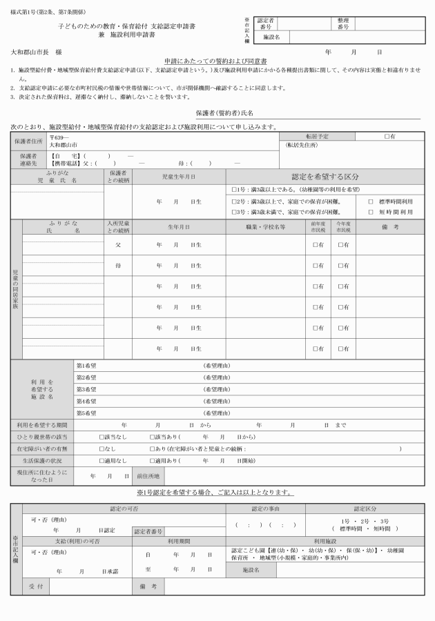 第2条 府令第2条第1項の規定による申請は、子どものための教育・保育給付支給認定申請書兼施設利用申請書(様式第1号)によるものとする。