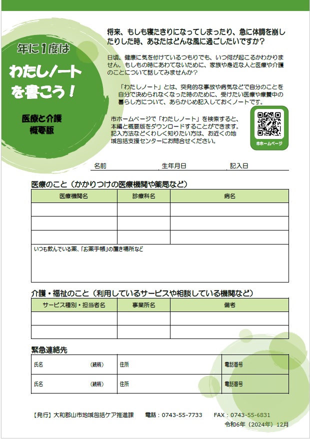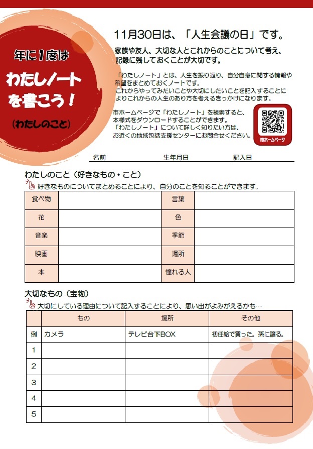 「わたしノート」とは、突発的な事故や病気などで自分のことを自分で決められなくなった時のために、自分の情報や要望・希望をあらかじめ記入しておくノートです。