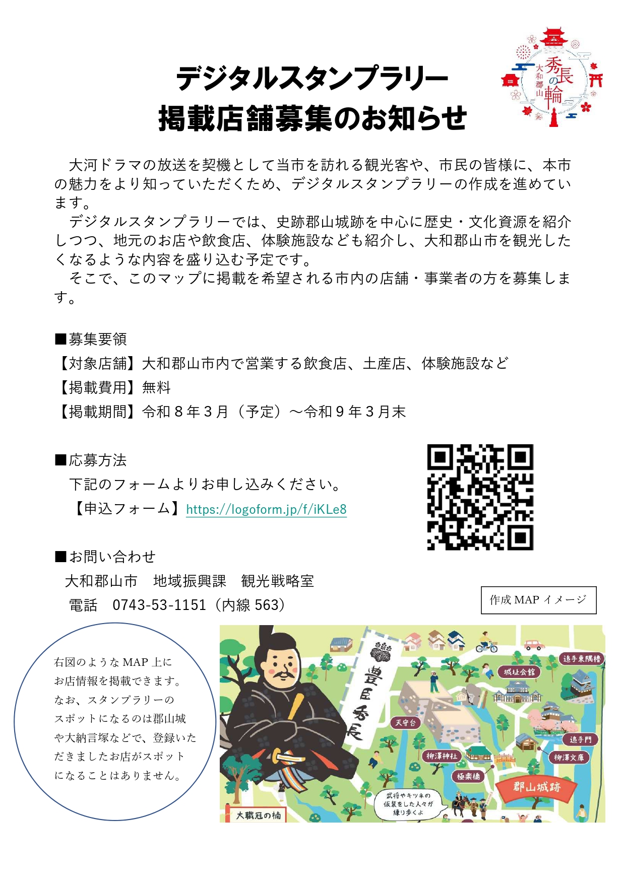 デジタルスタンプラリー内マップへの掲載店募集 更新日:2025年11月19日 ページID 16945 秀長さんゆかりの地スタンプラリー掲載店募集チラシ (PDFファイル: 198.0KB) この記事に関するお問い合わせ先 地域振興課 観光戦略室郵便番号:639-1198大和郡山市北郡山町248-4電話:0743-53-1151(内線563) ファックス:0743-55-4911メールフォームによるお問い合わせ