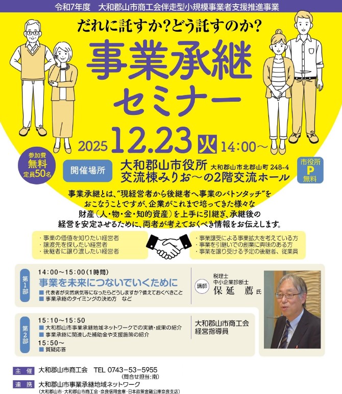 全国で喫緊の課題になっている中小企業・小規模事業者のみなさんの円滑な事業継承を促進するため、令和5年8月28日より四者(大和郡山市商工会、奈良信用金庫、日本政策金融公庫奈良支店、大和郡山市)が業務連携することで「大和郡山市事業承継地域ネットワーク」の事務局が開設されました。
