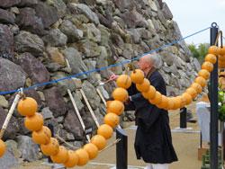 風なびく郡山城天守台上において、郡山城にぎわいづくり実行委員会(飯田喜代視会長)・大和郡山市の主催で、郡山城天守台展望施設の完成を祝い、関係者及び来賓によるテープカットや、火縄銃演武(筒井順慶鉄砲隊)・和太鼓記念演奏(やまと獅子太鼓)等のデモンストレーションが華やかに執り行われました。