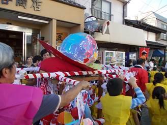 金魚ねぷたと柳神くん山車の巡行です。山車を飾り付けた子供たちが黄色いハッピを着て楽しそう。