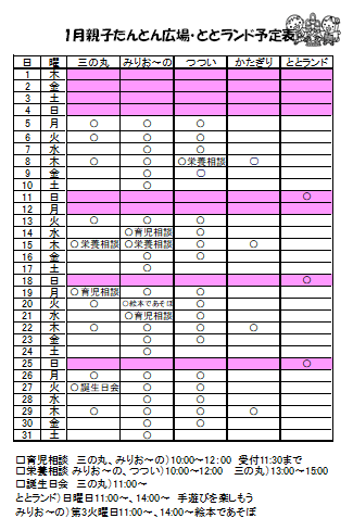 「ととランド」は子ども達が、保護者のみなさんと一緒に遊べる、みなさんの子育てを応援するところです。日曜日が休日のお父さん、平日に子育て広場に行けないお母さんもぜひお好きな時間にお気軽にお越しください。月ごとに遊びを計画しています。