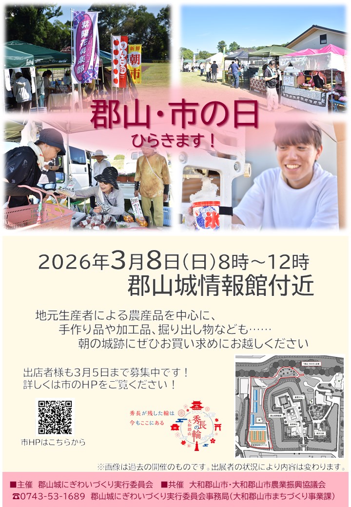 「郡山城跡公園」での賑わいづくりを目的に、生産者定期マーケットを開催します。